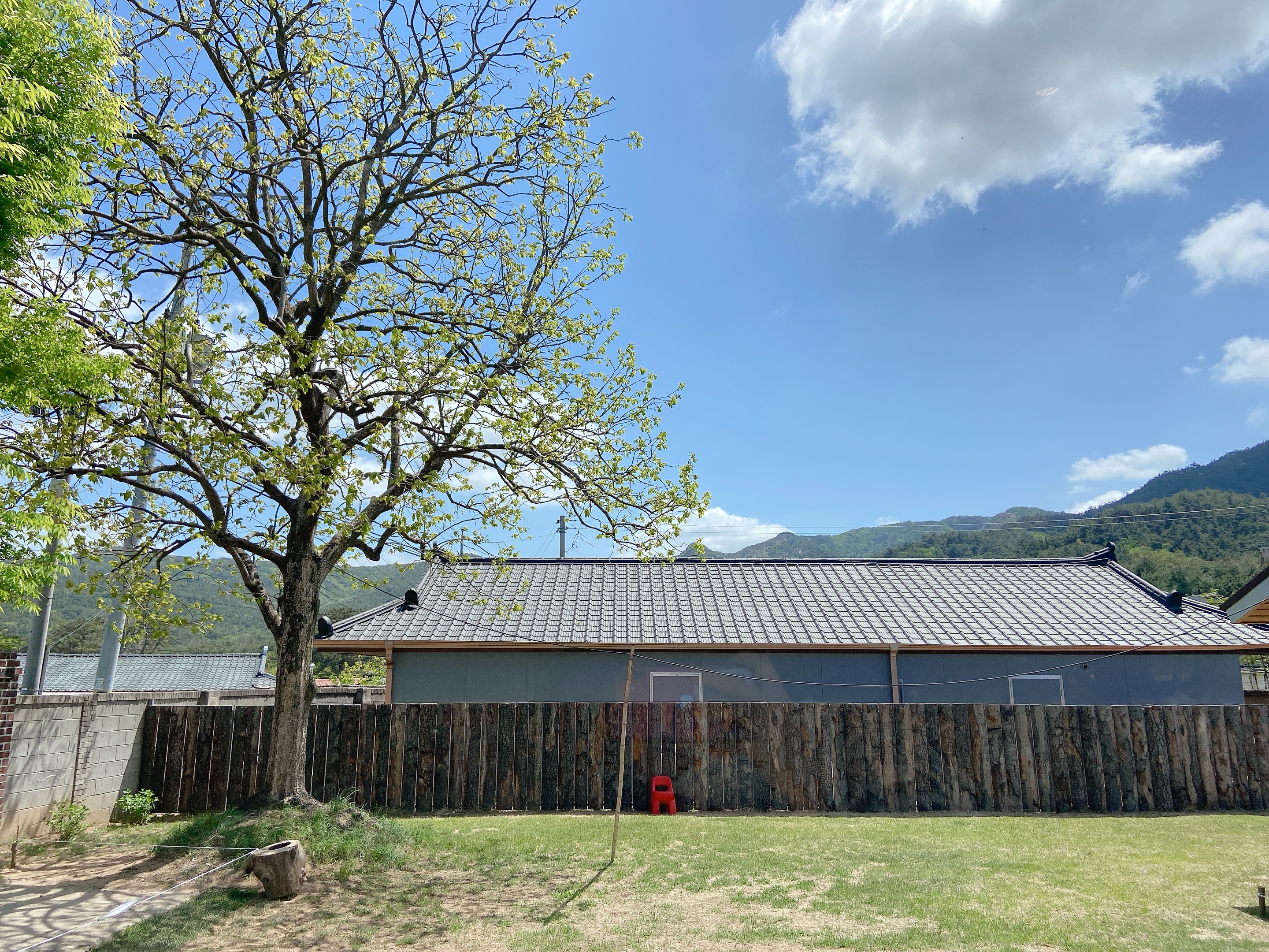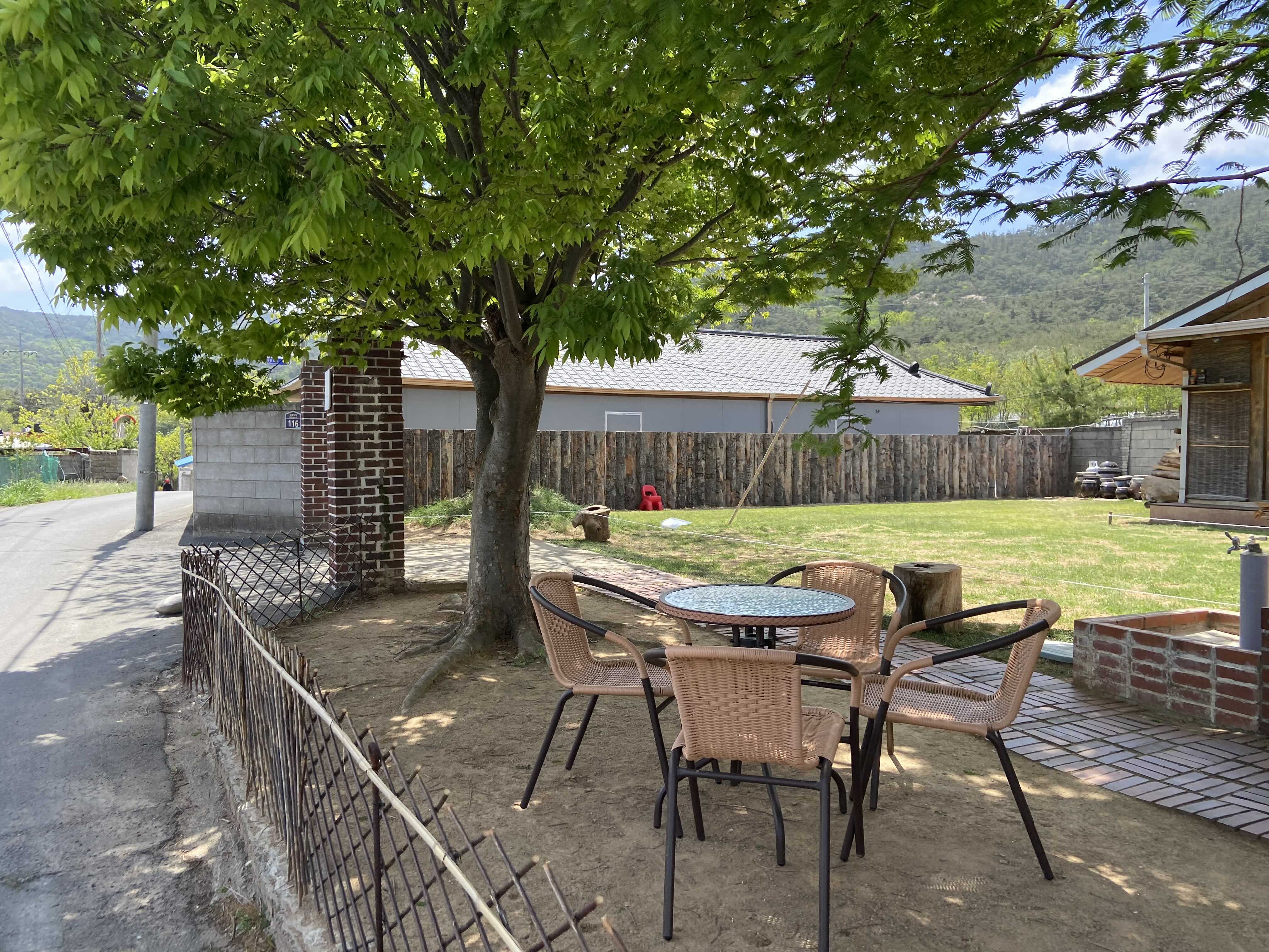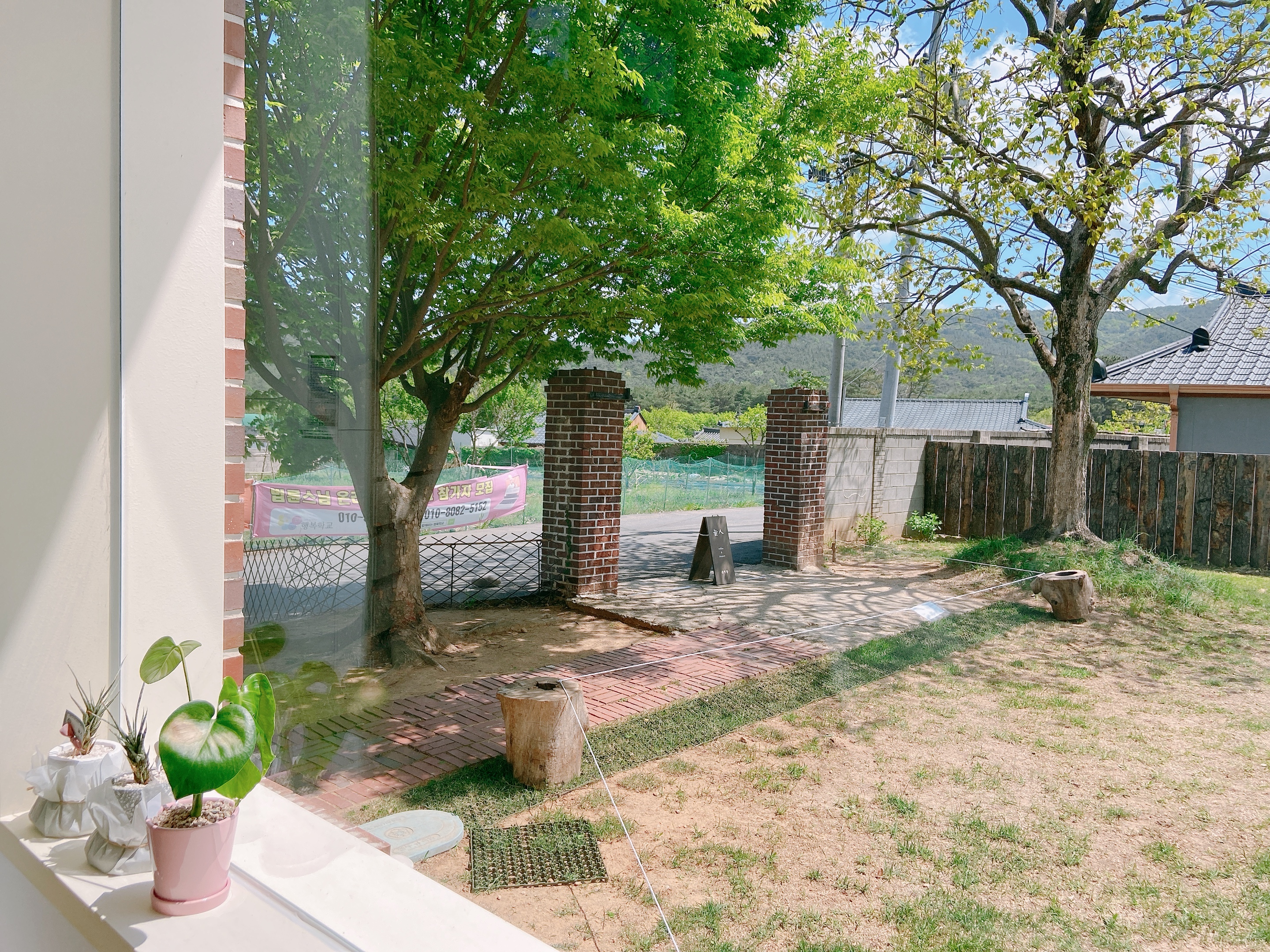 초록초록한 잔디마당과 큰 나무아래 테이블이 너무 예쁘다