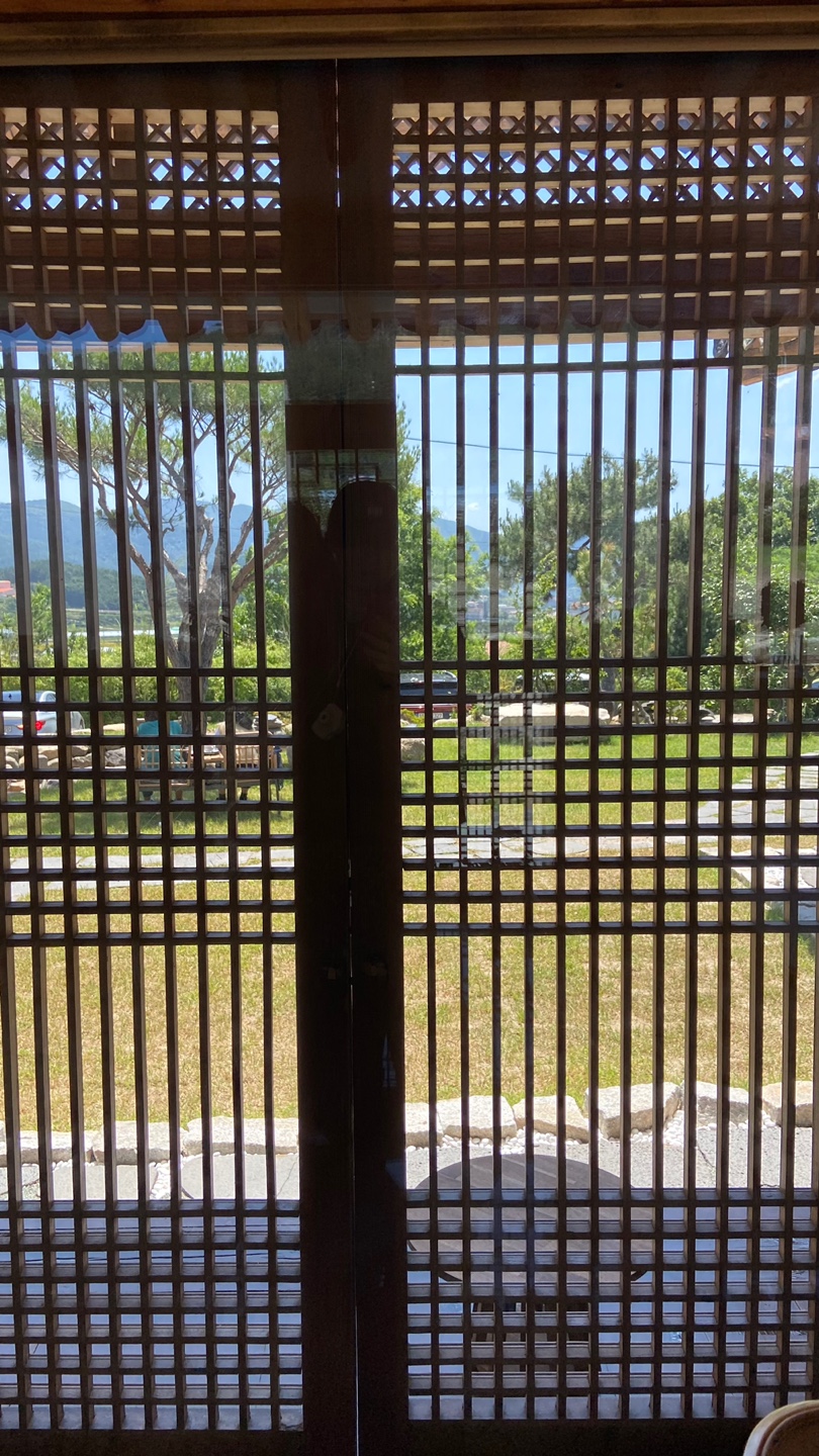 살문틈으로 보이는 소반과 마루. 그리고 정원