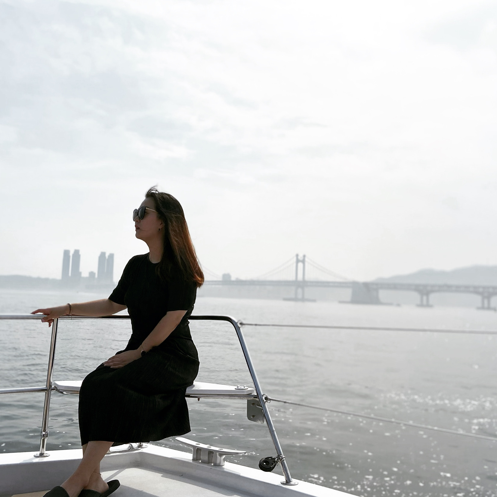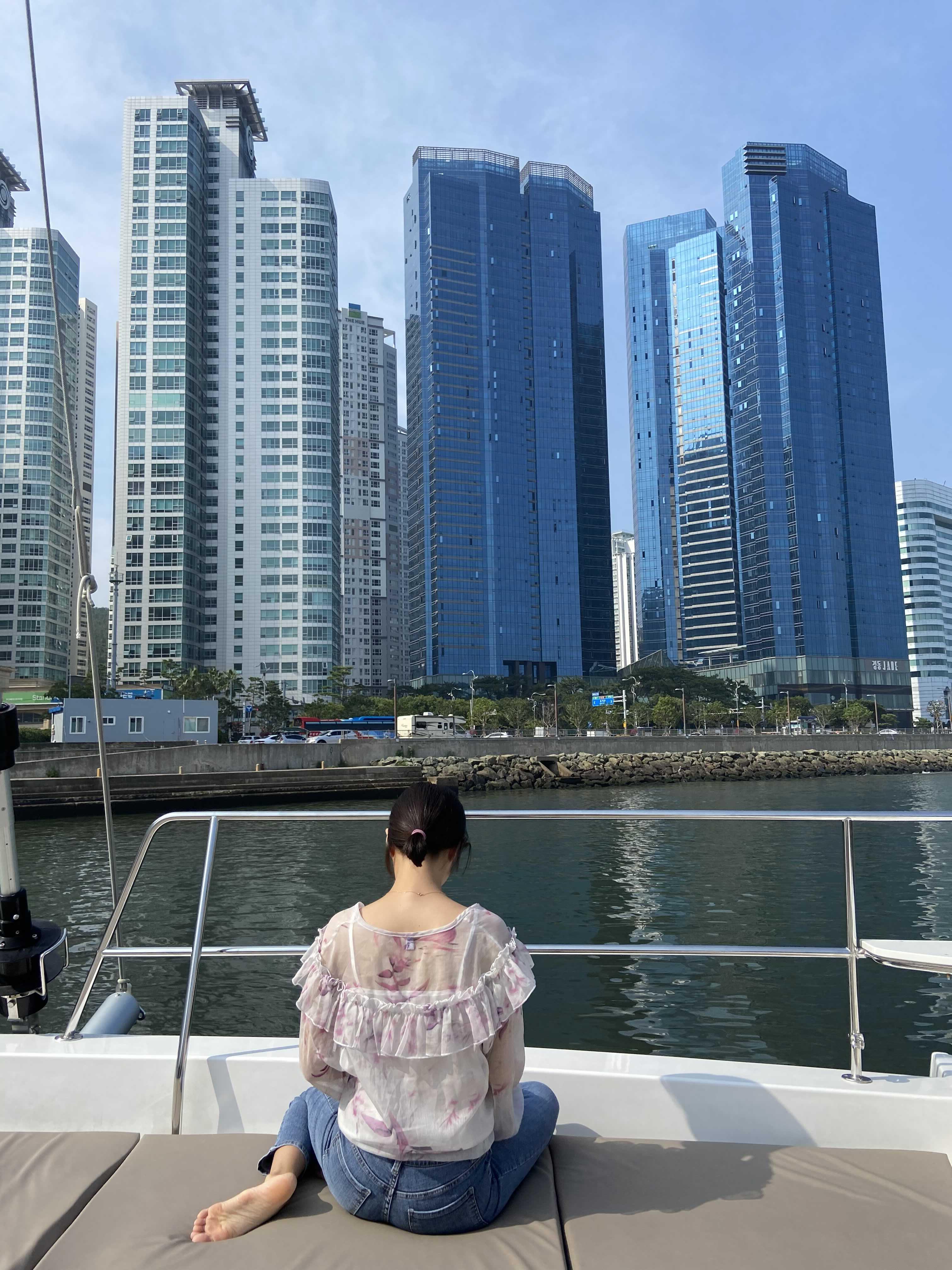 요트 선미쪽, 그리고 후미 그리고 조정석 앞쪽에 앉을 수 있는데 어우 안개가 많았음에도, 나쁜 미세먼지가 시야를 많이 가렸어도. 너무 예뻤음!!!!!