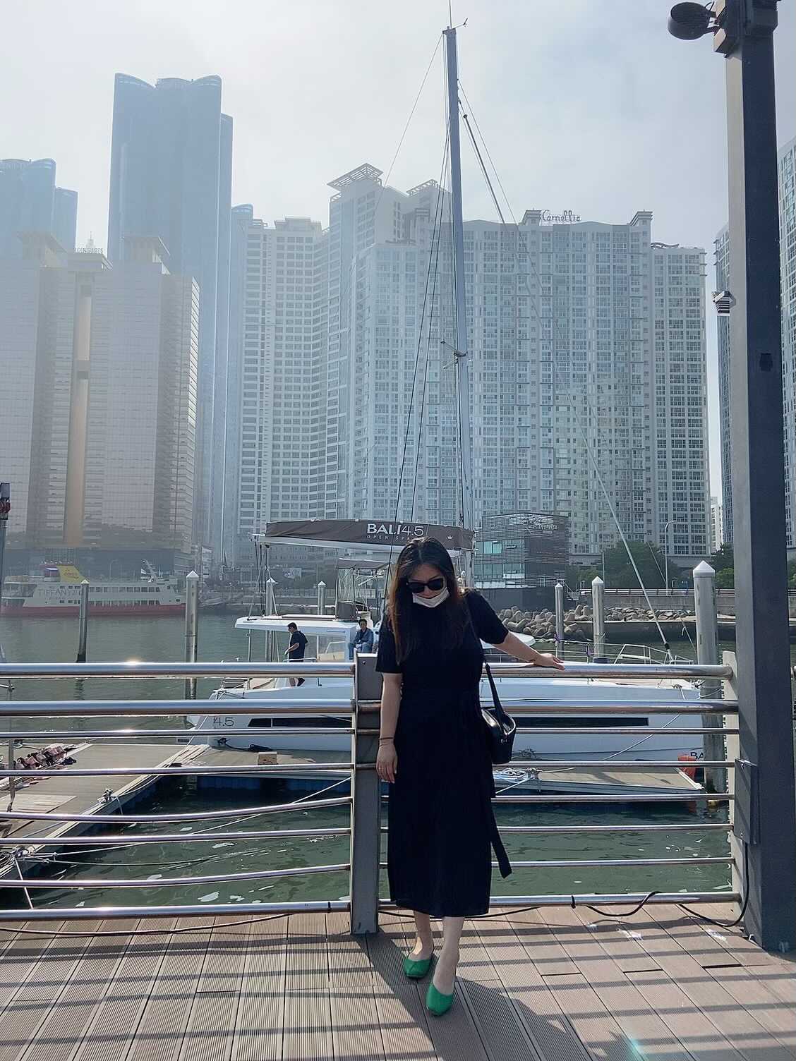 출발전 마린시티를 배경으로 요트 선미에 앉은 친구를 찰칵.